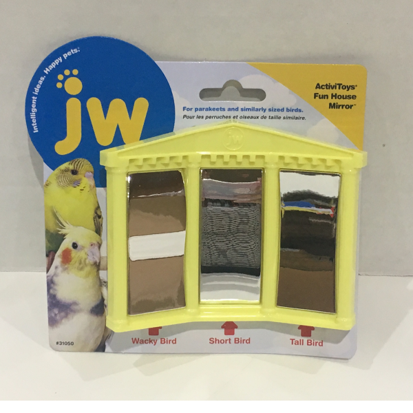 ActiviToys like the JW Fun House Mirror bird toy is designed to meet your pet birds natural need for physically and mentally stimulating activities. This clever bird toy will keep your feathered friend entertained for hours. The three mirrors show different altered reflections of your pet bird in each view, including short bird, tall bird and wacky bird. Be sure to pick up more than one ActiviToy and change the selection in your pet birds cage periodically to keep him interested and entertained.