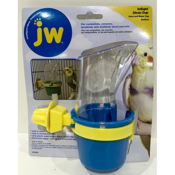 JW Clean Cup Feed & Water Cup is easy to remove and refill for your pet bird. Clear plastic guard keeps debris inside cage, and does not block visibility so that your pet bird feels comfortable placing its head inside. This easy-to-clean bird accessory fits all bird cages, including vertical and horizontal bars.