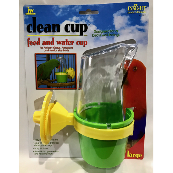 JW Clean Cup Feed & Water Cup is easy to remove and refill for your pet bird. Clear plastic guard keeps debris inside cage, and doesnt block visibility so that your pet bird feels comfortable placing its head inside. This easy-to-clean bird accessory fits all bird cages, including vertical and horizontal bars.