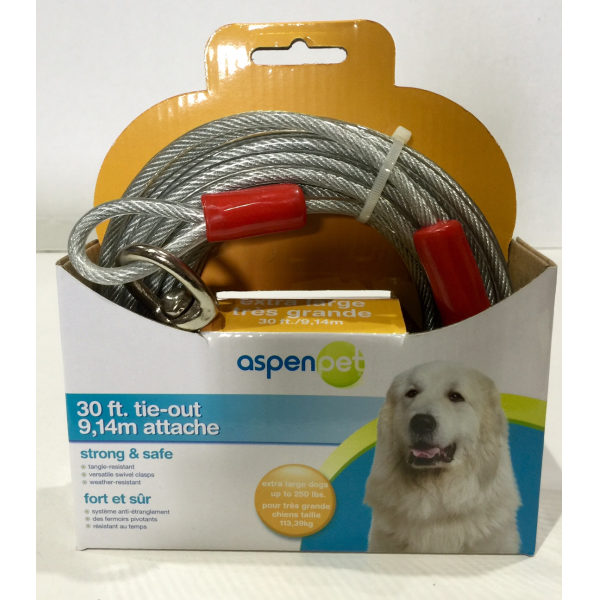Instructions: (Refer to illustration on back panel for visual reference) Select a site that is level and free of all obstructions. Attach one snap hook to containment device. Use with an Aspen Pet Trolley, Dome Spiral Stake, or attach to itself around a tree. Attach the other snap hook to the dring on your dogs collar or harness. Specifications and features: Snap Hooks, Containment device. Warning: This product is intended for dogs only. keep out of childrens reach. Do not use with choke type your or adjustable collars. Do not use a tieout chain, cable for warning your dog. Never us any tieout chain cable near or around obstacles in which your dog can become entangled. Keep your hands extremities clear of the toeout chain cable in case your dog lunges. Not all dogs can be cabled effectively owner supervision and judgament is requiered. Dogs known to be aggressive in nature should not be left unattended while on a tie out chain cable or trolley. Check the security of your tie out system regulary.