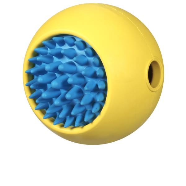 JW® Grass Ball is a tough rubber dog toy infused with vanilla extract that is as versatile as it is fun! This innovative ball is super durable and double-molded to stand up to tough chewers. Spiked top and bottom makes the Grass Ball a top choice for teeth cleaning, smooth sides make it an excellent fetch toy. The openings on each side allow the JW Grass Ball to be used as a treat ball too! Size 2"