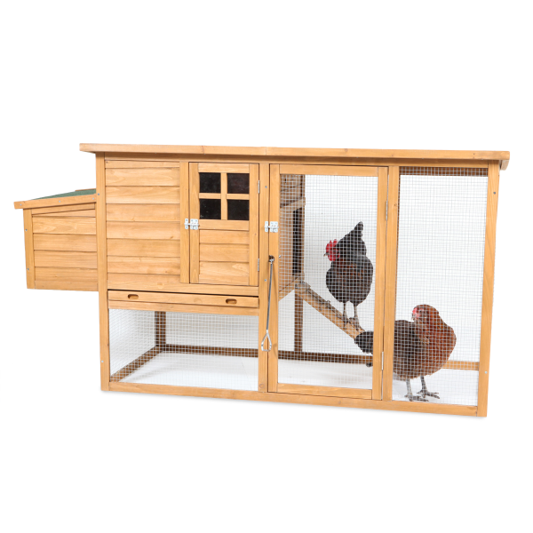 The Aspen Pet Flat Top Chicken Coop is the perfect housing solution for the backyard farmer. The locking lid and slide latches provide security from predators. The hinged roof, access doors and the "easy close" coop door provides an extra layer of safety and convenience. The double roosting bars, two nests and high peaked roof provide plenty of room for the hens to comfortably lay and the pull-out tray makes for easy clean up.