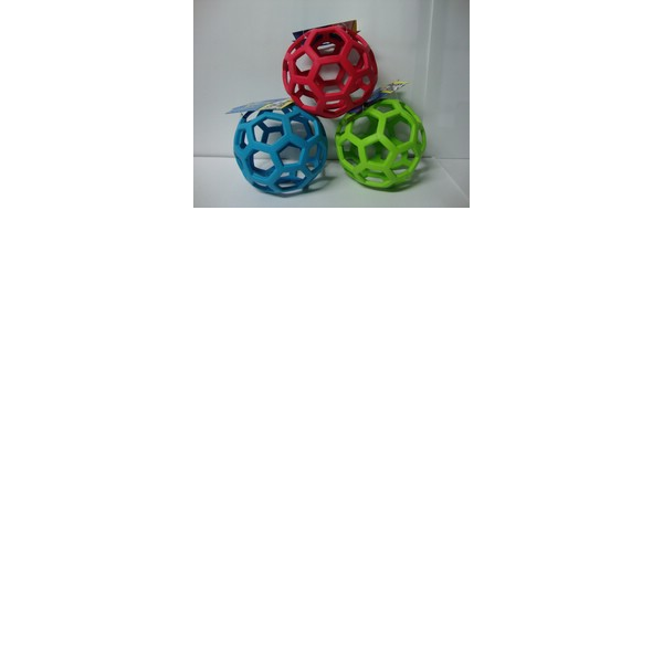 Juguete sumamente duradero. El material es suave y rebota. Por su forma y los agujeros que trae ofrece mas lugares para que la mascota lo pueda agarrar con facilidad. 22 cm diametro.