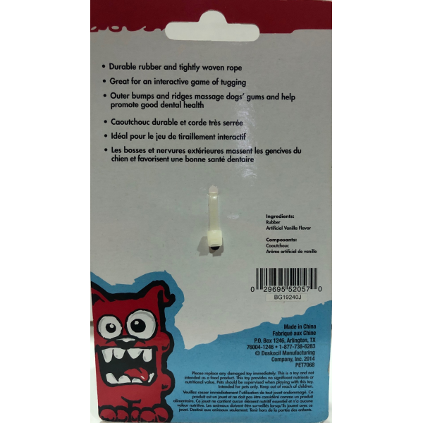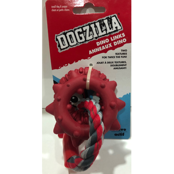 Designed to engage your dogs five senses, Dogzilla toys provide fun and innovative ways for your dog to play. Dogzilla® Dino Links are constructed of tightly woven rope and tough rubber, making it great for an interactive game of tug-of-war. The bumpy texture stimulates gums to promote good dental health for your dog. The durable construction holds up against even the strongest of chewers.