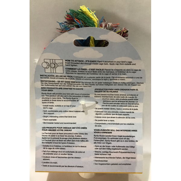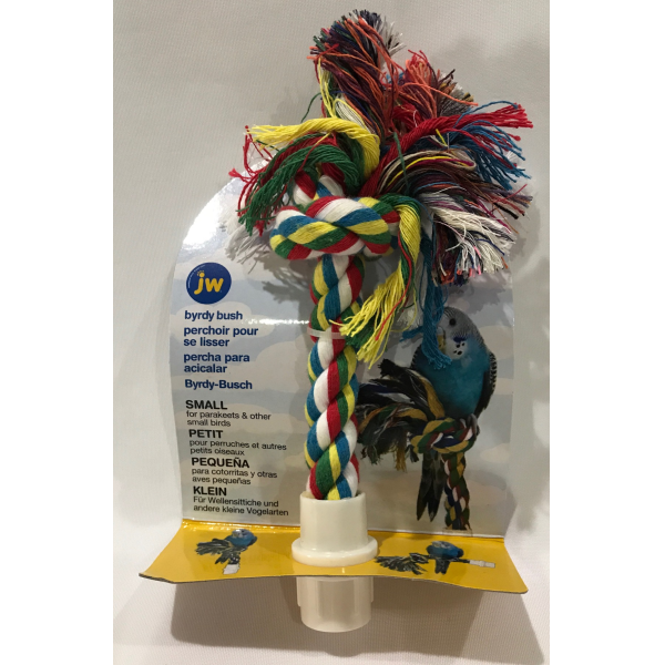 The JW Byrdy Bush is a must-have for your pet bird. Keep your bird stimulated with the Byrdy Bush to prevent boredom. The Byrdy Bushs tasseled end encourages healthy preening behaviors and helps to curb feather plucking. The multi-colored rope perch easily attaches to any cage configuration.