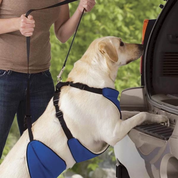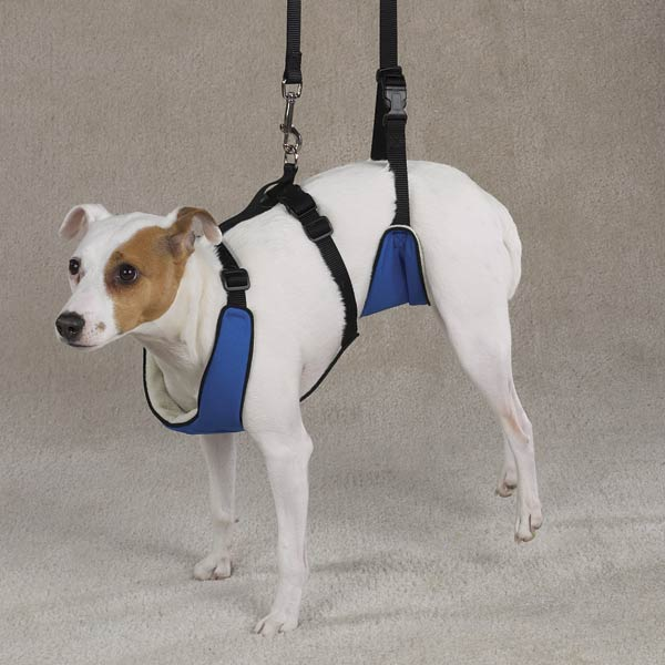 Lift up on carrying strap to support dog’s hindquarters as it stands and walks.