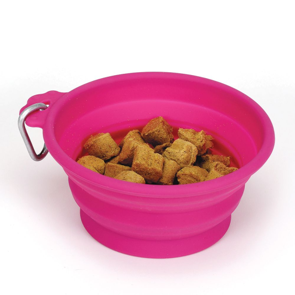 Nuestro conveniente Guardian Gear Bend-a-Bowls se expande y se recoge en un instante para proporcionar a los animales domésticos comida y agua en el camino.