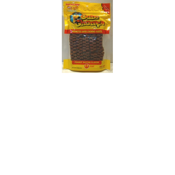 ENGLISH: Cube chomps. 17 counts. Peanut better flavor. NEW! 17 Count package of 6" large cubes made with a break away design for all size dogs. These tasty cubes promote safer chewing habits and they have an irresistible flavor that all dogs love. Available in Peanut Butter & Chicken Flavors.