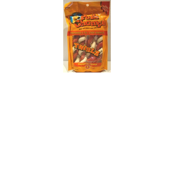 ENGLISH: Pork chomps. 4 count. Pepperoni twists flavor. These tasty twists are the safer alternative to rawhide that won´t stain carpet.