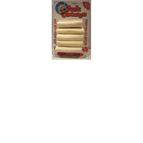ENGLISH: Pork chomps. 5 count. Baked. Delicious baked pork skin knotted so your dog can go to workª Lower in fat than pig´s ears and more easily digestible than beef rawhide. Long-lasting knots guaranteed to satisfy your most vigorous chewer. No artificial flavors or preservatives.