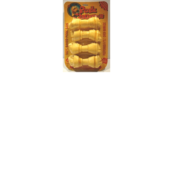 ENGLISH: Pork chomps. 4 caunt. Peanut Butter flavor. Delicious baked pork skin knotted so your dog can go to workª Lower in fat than pig´s ears and more easily digestible than beef rawhide. Long-lasting knots guaranteed to satisfy your most vigorous chewer. No artificial flavors or preservatives.