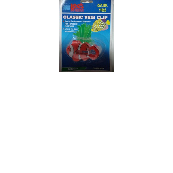 ENGLISH: Lee’s Classic Vegi Clip secure vegetables, such as spinach, romaine lettuce, or zucchini. Fish need their veggies too! Large suction cup for attachment to aquarium glass Allows easy access for feeding fish 1/Blister Card 12/Inner Pack.