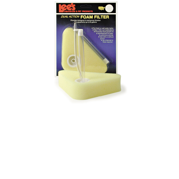 ENGLISH: Lees. Description: triangle Foam Filter Capacity: Up to 25gal. / 95 Ltr Packaging Blister pack The filters composed of open-celled foam which provides enormous amounts of usable surface area for beneficial bacteria to colonize. This bacteria breaks down harmful waste substances (ammonia & nitrite), making your aquarium a safer environment for your fish to live and breed. This fundamental filter is excellent for breeding all types of aquarium fish, as well as for hatching and raising brine shrimp as it will not trap nor harm them. The Dual Action Foam Filters are available in 4 models to accommodate the filtering needs of various-sized aquariums.