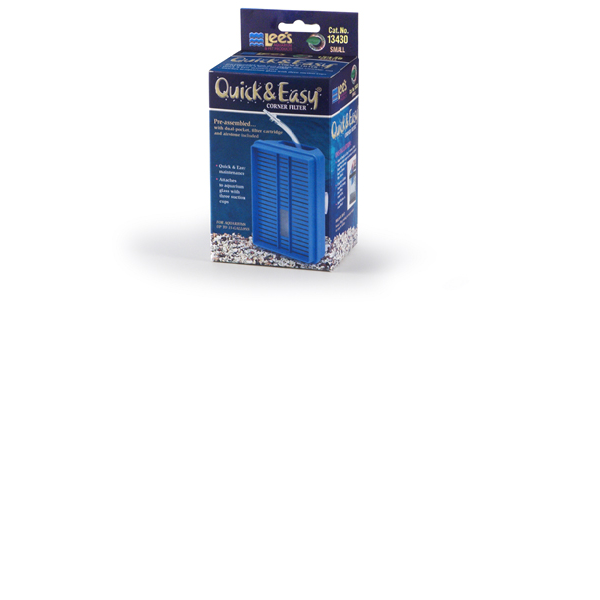 ENGLISH: Lees. Description Quick & Easy Corner Filter. Size Small. Capacity Up to 10 Gal/ 38 Ltr. Packaging Boxed. A mechanical filtration system that is complete, ready for installation in your aquarium. Simply attach to airline and pump. The special design allows for maximum water circulation. It has 3 suction cups for stability. The solid plastic window on the filter cover allows viewing for maintenance requirements.
