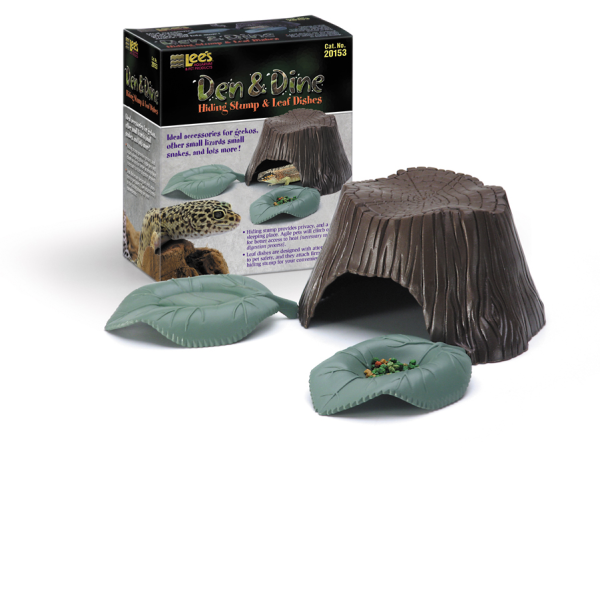 ENGLISH: Lees. Description Den & Dine Hiding Stump and Leaf Dishes Packaging Boxed. Ideal for geckos, other small lizards and small snakes. Hiding stump provides privacy and a dark sleeping place. Agile pets will climb on top for better access to heat. Leaf dishes are designed with attention to pet safety and attach firmly to the hiding stump for your convenience. Made of plastic for easy cleaning.