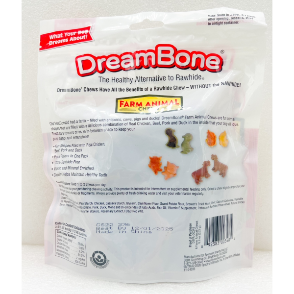 El viejo MacDonald tenía una granja llena de gallinas, vacas, cerdos y patos. Los masticables para animales Deam Bone Farm son divertidas formas de animales que están rellenos con una deliciosa combinación de pollo, carne de res, cerdo y pato reales en el interior que a su perro le encantará. ¡Trate como recompensa o como refrigerio intermedio para mantener a su cachorro feliz y entretenido!