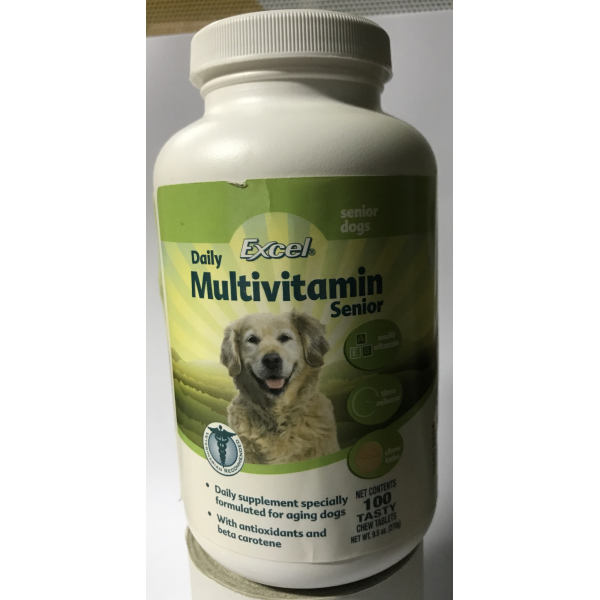 Excel multivitamin, specially formulated for aging dogs, with antioxidants, including Lutein, recommended by veterinarians, provides essential vitamins and minerals required for senior dogs. 100 tabletas. Advanced time relase formula provides gradual release of age-critical vitamins and minerals, resulting in balanced supplement absorption. how to use: dogs under 4.54 kg 1 / 2 tablet daily. Dogs of 4.54 to 22.7 kg 1 tablet a day Dogs Over 22.7 kg 2 tablets of day For sick, convalescing, pregnant, nursing dogs 2 tablets a day. May be given with other supplements, such as skin and joint care.
