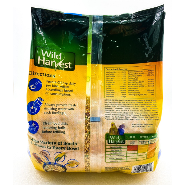 Wild Harvest Advanced Nutrition Parakeet provides premium nutrition for developing, maintaining and enjoying good health. Parakeets need a diet containing seeds and grains to help support a healthier life. This specially formulated, enriched food contains important protein, fat, vitamins and minerals that support a strong and healthy body for your Parakeet . Wild Harvest Advanced Nutrition Parakeet not only offers ideal nutrition for your pet, but also a comprehensive range of ingredients. Varied diets are particularly important for Parakeets in order to help replicate diets found in their natural habitat and encourage natural foraging behavior. Foraging for food provides Parakeets with important physical and mental stimulation, and it helps keep your pet healthy and happy!