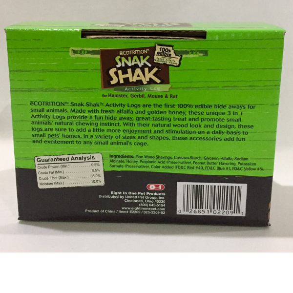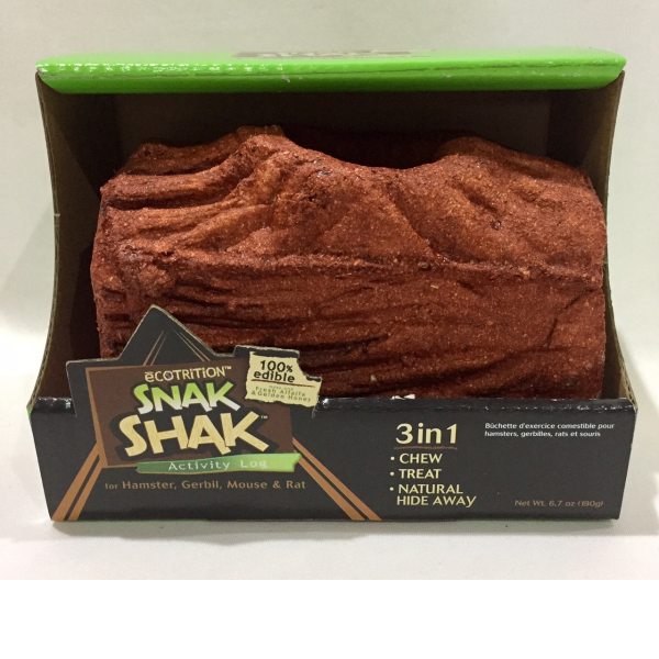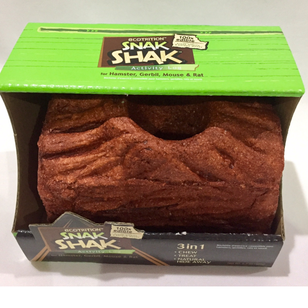 ECOTRITION Snak Shak Activity Logs are the first 100% hide aways for small animals. Made with fresh alfalfa and golden honey, these unique 3 in 1 Activity Logs provide a fun hide away, great-tasting treat and promote small animals natural chewing instinct. With their natural wood look and desing, these logs are sure to add a little more enjoyment and stimulation on a daily basis to small pets homes. In a variety of sizes and shapes, these accessories add fun and excitement to any small animals cage.