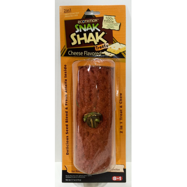 Take the one of a kind, 100% edible snak shak log and stuff half with fresh alfalfa and half with a delectable seed belnd for made with alfalfa and golden honey, the realistic wood look snak shak log has a hard texture that promotes small animals´natural chewing instict and the diverse blend and fresh alfalfa inside stimulates small animals´curiosity for hours of fun. Packed with small animals´favorite ingredients and the one of a kind 100 % edible snak shak log, treat stuffers make the perfect any-tyme 2-in-1 treat for your pet. Directions: Place on bottom of cage. Replacewhen consumed. Store in a dry place for maximum freshness. Guaranteed analysis: Crude protein (min) - 6.0%, crude fat (min) - 3.0%, crude fiber (max) - 20.0%, moisture (max) - 16.0%.Ingredients: Pine wood shavings, cassava starch, alfalfa, dehydrated alfalfa meal, whole corn, milo, sunflower seed, wheat, oat groats, buckwheat, safflower seed, straw liquid mix, water, honey, glycerin, propylene glycol, modifed starch, maltose, corn oil, wheat middlings, groud corn, feeding oatmeal, soybean hulls, cane molasses, wheat, salt, grount limestone, dicalcium phosphate, monoammonium phosphate, potassium chloride, l-lysine, dl-methionine, vitamin b12 supplement, zinc sulfate, menadione sodium bisulfite complex (source of vitamin K), folic acid, d-biotin, magnesium oxide, ferrous carbonate, ferrous sulfate, zinc oxide, manganous oxide, ethylenediamine dihydriodide, sodium alginate, propionic acid, peanut flavoring, corn flavoring, potassium sorbate (preservative), FD&C red #40, FD&C yello#5, FD&C Blue #1