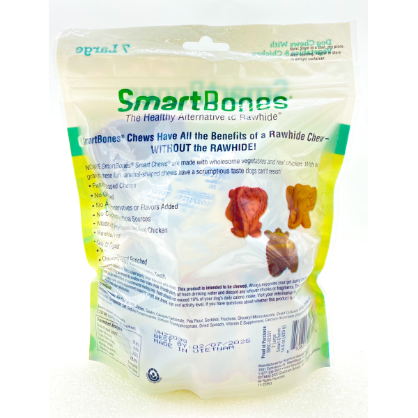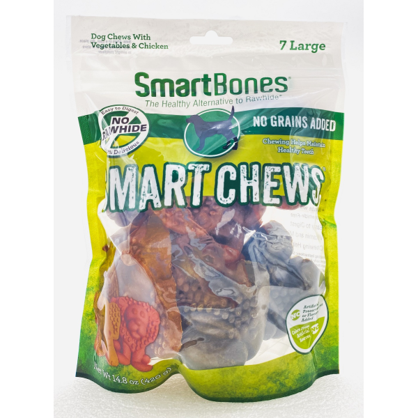 NO RAWHIDE Smart Bone, Smart Chews are made with wholesome vegetables and Real Chicken. With no grains added, these fun, animal-shaped chews have a scrumptious taste dogs cant resist!