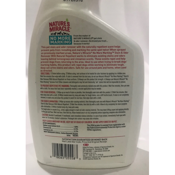 This pet stain and odor remover with the naturally repellent scent helps prevent pets from revisiting and marking the same spot twice! When sprayed on previously marked areas, Natures Miracle No More Marking Stain & Odor Remover With Natural Repellent works to eliminate existing stains and odors leaving behind lemongrass and cinnamon scents. these scents repel and help prevent dogs from returning to the area. ideal to use when trying to break dogs marking habits, this prod will repel dogs whilw working to eliminate tough, deep-set urine stains and odors. Safe for use around pets and home, when used as directed.
