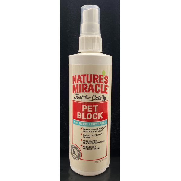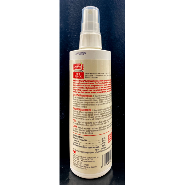 1)Shake well before using. 2) If spraying on fabrics, test for color fastness before use by applying to a hidden area; wipe with a cloth. If color is removed from the test area, do not use on those surfaces. *3)Apply Pet Block Cat Repellent Spray to areas you wish to keep your cat away from such as beds, furniture or rugs. Re-apply daily or as needed until undersirable habit is broken. For best results use spray in conjunction with training. Praise pet when positive behavior is exhibited.