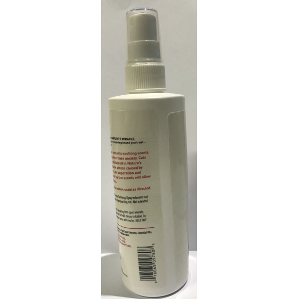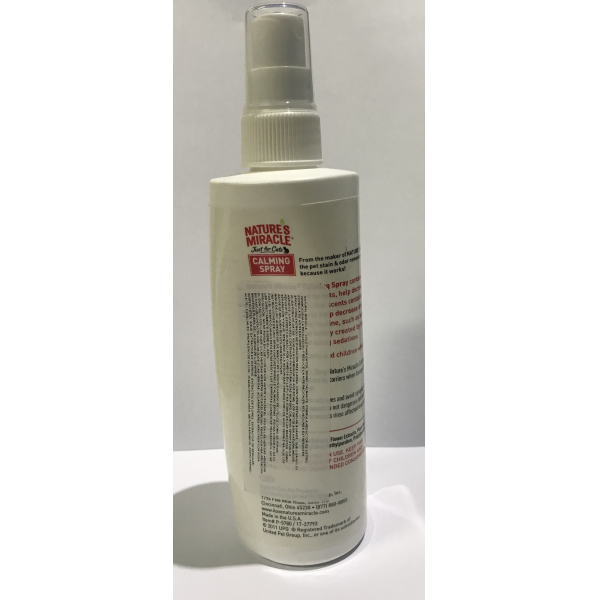 LONG LASTING CONCENTRATED SPRAY, CONTAINS SOOTHING SCENTSWHICH, WHEN SMELLED BY CATS, HELP DECREASE ANXIETY. CATSARE NATURALLY SKITTISH, THE SCENT CONTAINED IN NATURES MIRACLE CALMING SPRAY HELP DECREASE STRESS CAUSED BY CHANGES IN PETS DAILY ROUTINE, SUCH AS SEPARATION AND TRAVEL. THE FEELING IF SAFETY CREATED BY THE SCENTS WILL ALLOW CATS TO RELAX WITHOUT USING SEDATIVES.