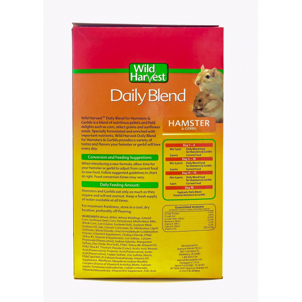 Will Harvest Daily Blend for Hamnster Y Gerbils is a blend of nutritions pellets and field delights such as corn, select grains and sunflower seeds. Specially formulated and enriched with important nutrients, Wild Harvest Daily Blend for Hamsters y Gerbils provides a variety of tastes and flavors your hamster or gerbil will love every day.