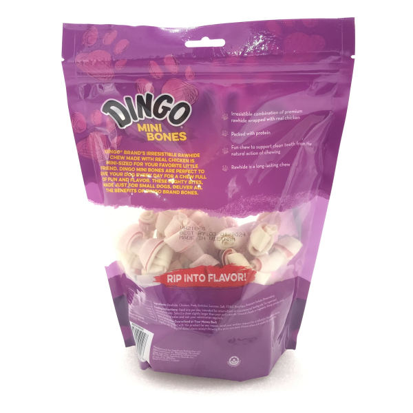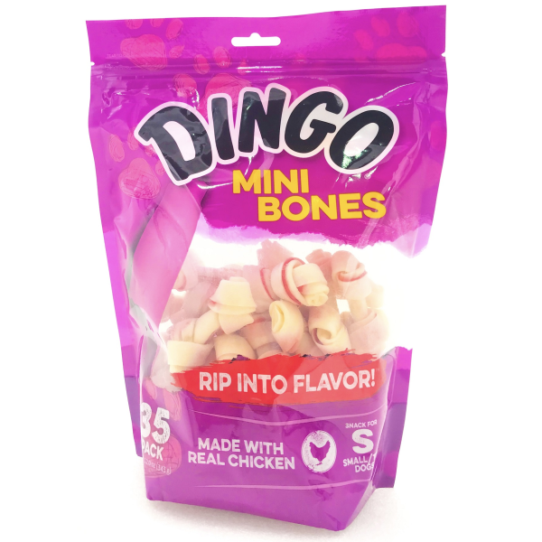 Dingo Brands irresistible rawhide chew made with real chicken is mini-sized for your favorite little friend. Dingo mini bones are perfect to give your dog every day for a chew full of fun and flavor. These mighty bites, made just for small dogs, deliver all the benefits of dingo brand bones.