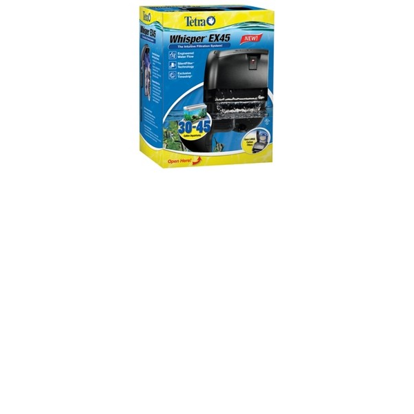 ESPAÑOL: Tetra. Whisper EX45 filtro de cascada con sistema de marca para cuando esta sucio, y necesita remplazo, es silencioso y especial para peceras de 30-45 galones, Utiliza filtros con mayor capacidad y como siempre con carbon incluido para la absorcion de toxinas.