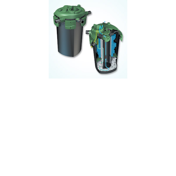 INGLES: The TetraPond® ClearChoice™ Pressure Filters force water through sponges and then through bio-rings to help maintain clear and healthy pond water. Its biological filtration converts harmful ammonia into relatively harmless nitrates. It is designed with an easy, one-step back-flush valve for cleaning sponges and bio-media. You can also bury to conceal and don’t have to worry about a leak due to its robust latches and O-ring seal. Each pressure filter is sold as either a stand-alone unit or with an integrated UV clarifier to provide permanent control of suspended algae and reduce green water. If you later decide you want to add a UV clarifier to your pressure filter TetraPond® also provides UV upgrade kits. Designed for ponds up to 4000 gallons. 15 inches diameter of 23 inches height.