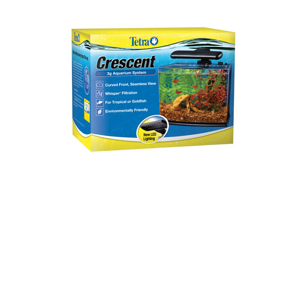 ENGLISH: Tetra. Crescent 3g Aquarium System. Crescent. Curved front, seamless view. Whisper Filtration. For tropical or goldfish. Environmentally friendly.