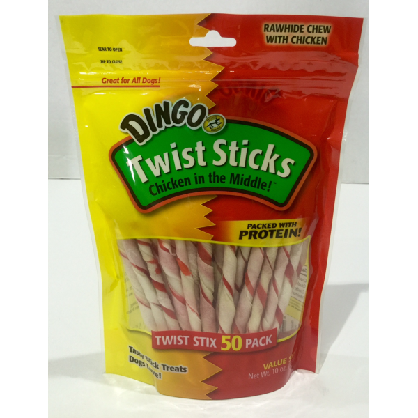 Dogs love the taste of Dingo bones with Real Chicken in the Middle! Dingo Sticks offer the same great taste, but in a fun and playful shape large dogs cant resist. Dingo Twist Sticks are made with high quality ingredients to give your dog a fun and delicious treat bursting with flavor.