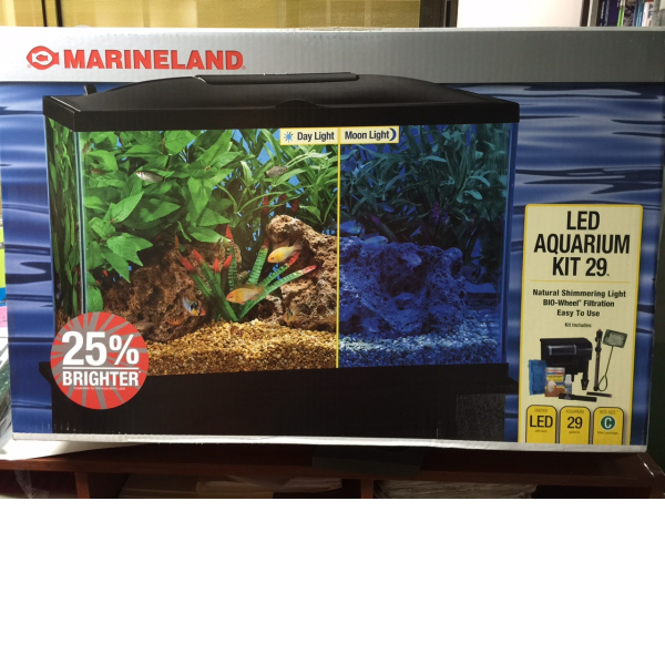 Pecera Marineland para 29 galones, viene con filtro de cascada con Biowheel. las medidas son Medida: 30.5"(77cm) X 12.5"(32cm) X 17"(44cm).