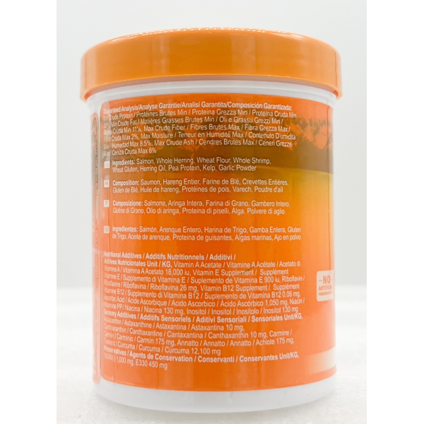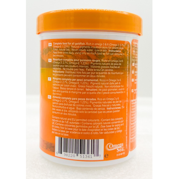 Complete food for all Goldfish. Rich in omega 3&6 (Omega-3: 2.7%, Omega-6: 1.23%). Natural pigments in salmon skins for vibrant colors. Fresh, natural fats. Never clouds water. Low in ash.