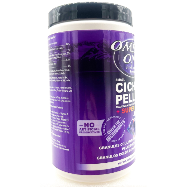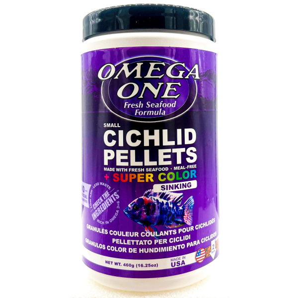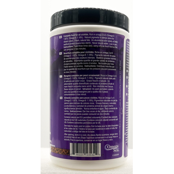 Complete food for all cichlids. Rich in omega 3&6 (Omega-3: 1.82%, Omega-6: 1.18%). Natural pigments in salmon skins for vibrant colors. Fresh, natural fats. An abundance and variety of fresh seafood protein means less starch. Never clouds water. Low in ash.