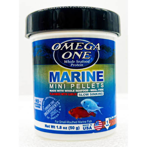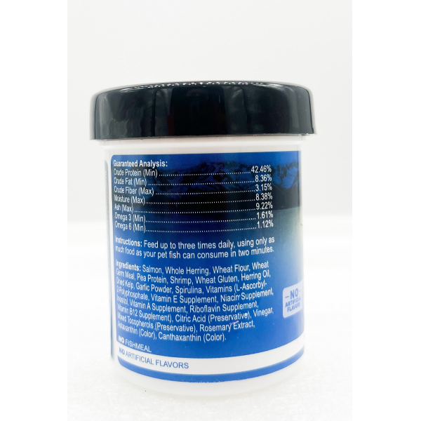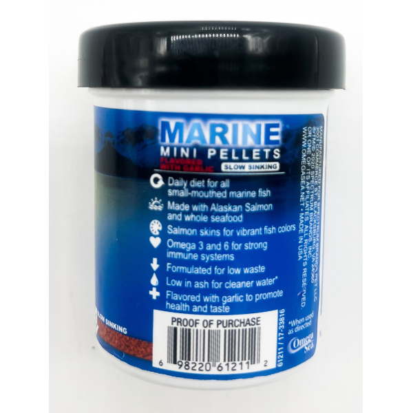 Daily diet for all small-mouthed marine fish - Made with Alaskan Salmon and Whole seafood - Salmon skins for vibrant fish colors - Omega 3 and 6 for strong immune systems - Formulated for low waste - Low in ash for cleaner water* (*When used as directed) - Flavored with garlic to promote health and taste.
