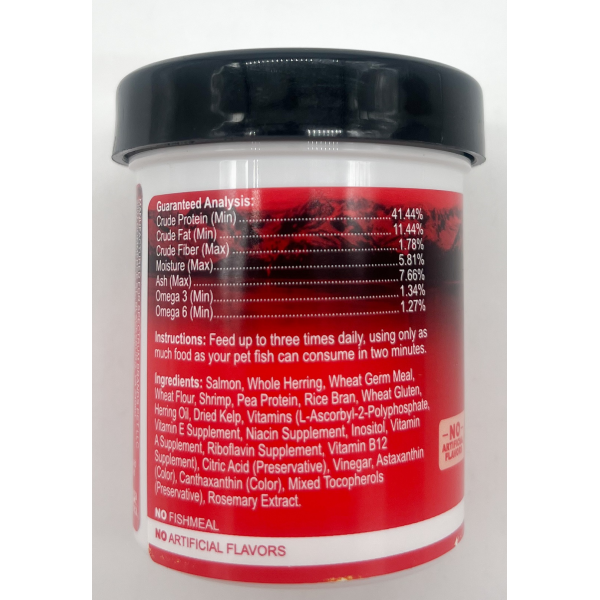Daily diet for all small-mouthed fish - Made with Alaskan Salmon and Whole seafood - Salmon skins for vibrant fish colors - Omega 3 and 6 for strong immune systems - Formulated for low waste - Low in ash for cleaner water* (*When used as directed)