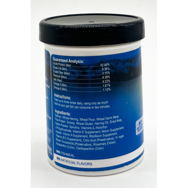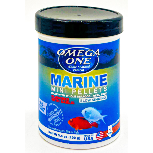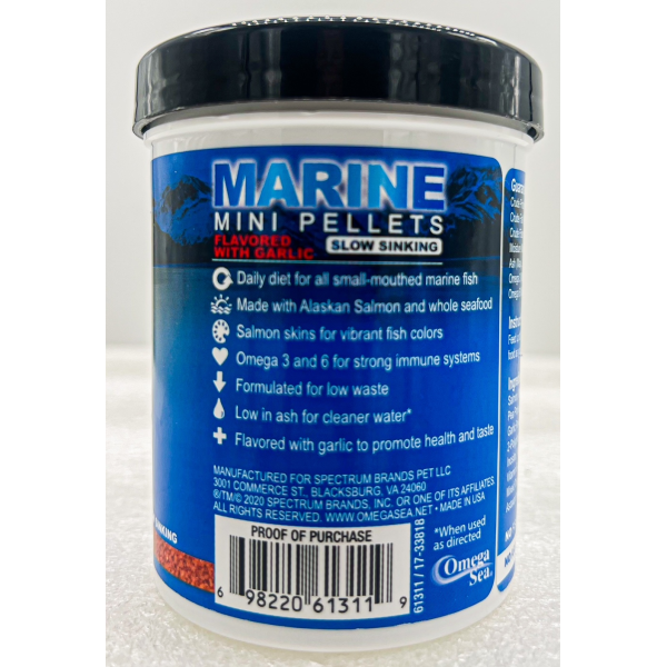 Daily diet for all small-mouthed marine fish - Made with Alaskan Salmon and Whole seafood - Salmon skins for vibrant fish colors - Omega 3 and 6 for strong immune systems - Formulated for low waste - Low in ash for cleaner water* (*When used as directed) - Flavored with garlic to promote health and taste.