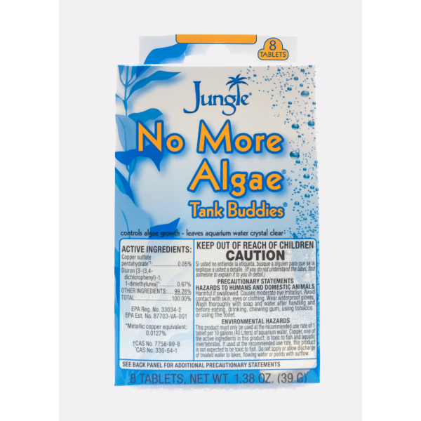 Directions for use: for aquariums and containerized ponds only. No more algae helps inhibit the growth of many types of algae in freshwater aquariums, including suspended algae blooms and algae which grow on the sides of glass and acrylic tanks. Do not use in tanks with live plants, snails or other invertebrates. Remove carbon from filter during use. Use one tablet for each ten gallons (40L) of aquarium water. Repeat treatment when algae growth begins to appear.