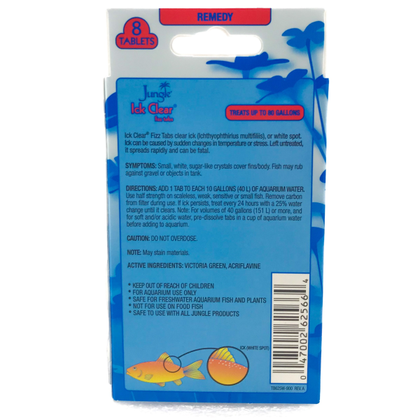 Ick clear fizz tabs clear ick (Ichthyophthirius multifiliis), o mancha blanca. Ick puede ser causado por cambios repentinos de temperatura o estrés. Si no se trata, se propaga rápidamente y puede ser fatal.