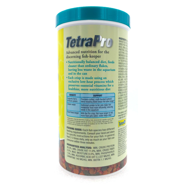 Support: Precision-crafted, multi-faced nutrient blend including Biotin keeps fish alive longer*. Optimized protein to fat ratio helps fish metabolize food more efficiently, reducing waste in the aquarium. With the pro crisp, fish have longer to eat, more food gets eaten, water stays clear. (*Independent university laboratory feeding trials demonstrate superior results with representative ornamental species (in terms of low mortality, high growth, food acceptance, fish coloration and body composition) for the Tetra Crisps diet when compared with the leading US competitors)