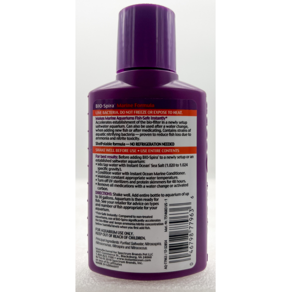 Acelera el establecimiento del biofiltro en un acuario de agua salada recién instalado. También se puede utilizar después de un cambio de agua, al añadir peces nuevos o después de medicar. Contiene cepas de bacterias nitrificantes acuáticas, que han demostrado reducir la pérdida de peces debido a la toxicidad del amoníaco y los nitritos.