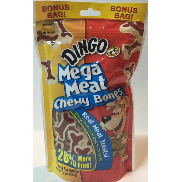 Español: Dingo huesitos masticables de carne. Hechos con carne real, huesitos con sabor a carne con carne en el centro. English: Dingo mega meat chewy bones. Real meat treats. Chewy bones with meat in the middle.