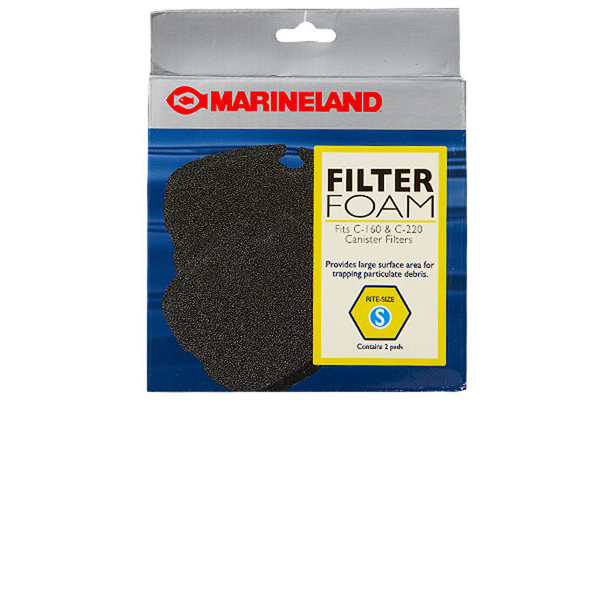 ENGLISH: Marineland, Filter Foam. Fits C-160 andC-220 canister filters. Provides large surface area for trapping particulate debris. Contains 2 pads. Rite-size S. Stage 1, Mechanical filtration. The filter foam pads screen out dirt and debris. MFF should be cleaned and rinsed every three weeks and replaced every 9 weeks. Do not clean with soaps or abrasives.