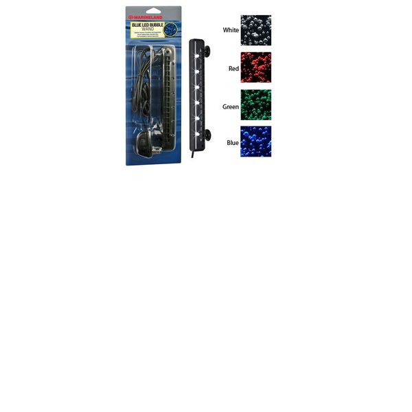 Marineland. White Led Bubble. Bubbles improved circulation and oxygenation Accent lighting adds a beautiful glow for freshwater or marine aquarium. Accent light and Bubbles, beautiful underwater lighting effects are created with the LEDs while the bubbles improve the circulation and oxygenation. Easy to Install, Accent lighting and bubbles are provided with a single piece of equipment. The 10 ft long power cord and the suction cups allow placement anywhere in the aquarium. Fully Submersible. The low voltage power adapter allows the LED bubble wand to be completely under water. Directions for Use: 1) Attack Airline Tubing (sold separately) to Air inlet on the LED bubble Wand.2.Make sure airstone is securely in place.3. Connect airline tubing to an air pump(sold separately) to prevent back siphoning.4.Connect power card to transformer.5.Position ans secure LED bubble wan, either on the bottom or back of your aquarium with repositionable suction cups.6.Plug transformer and air pump into electrical outlet. NOTE: Make a drip loop for safety.