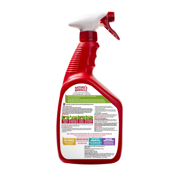 Antes de usar, pruebe la solidez del color de las superficies a tratar aplicándolas en un área oculta. Espere 5 minutos y luego limpie con un paño blanco. Si se elimina el color del área de prueba, no use el eliminador de manchas y olores Natures Miracle en esas superficies. No use el producto en telas especiales de madera dura, cuero, gamuza, seda o lana sin tratar. Utilice siempre este producto primero. Otros limpiadores y detergentes pueden fallar y fijar químicamente las manchas que serán imposibles de eliminar.