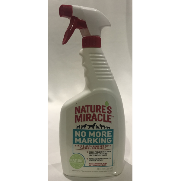 This pet stain and odor remover with the naturally repellent scent helps prevent pets from revisiting and marking the same spot twice! When sprayed on previously marked areas, Natures Miracle No More Marking Stain & Odor Remover With Natural Repellent works to eliminate existing stains and odors leaving behind lemongrass and cinnamon scents. these scents repel and help prevent dogs from returning to the area. ideal to use when trying to break dogs marking habits, this prod will repel dogs whilw working to eliminate tough, deep-set urine stains and odors. Safe for use around pets and home, when used as directed.