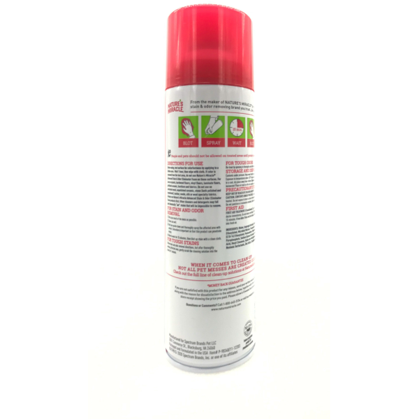 Directions for Use: Before using, test surface for colorfastness by applying to a hidden area. Wait 1 hour, then wipe with cloth. If color is removed from the test area, do not use Natures Miracles Advanced Stain & Odor Eliminator Foam on those surfaces. For use on carpets, hardwood floors, vinyl floors, laminate floors, polished ceramic, furniture and fabrics. Do not use on untreated wood, unpolished ceramic, stone (both polished and unpolished), leather, suede, silk or wool specialty fabrics. Always use Natures Miracles Advanced Stain & Odor Eliminator Foam products first. Other cleaners and detergents may fail and chemically "set" stains that will be impossible to remove.